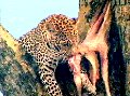 padlinożercami (hieny) wciąga swoją zdobycz na drzewo. Często